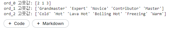 print(f'{feature} 고윳값: {train[feature].unique()}')