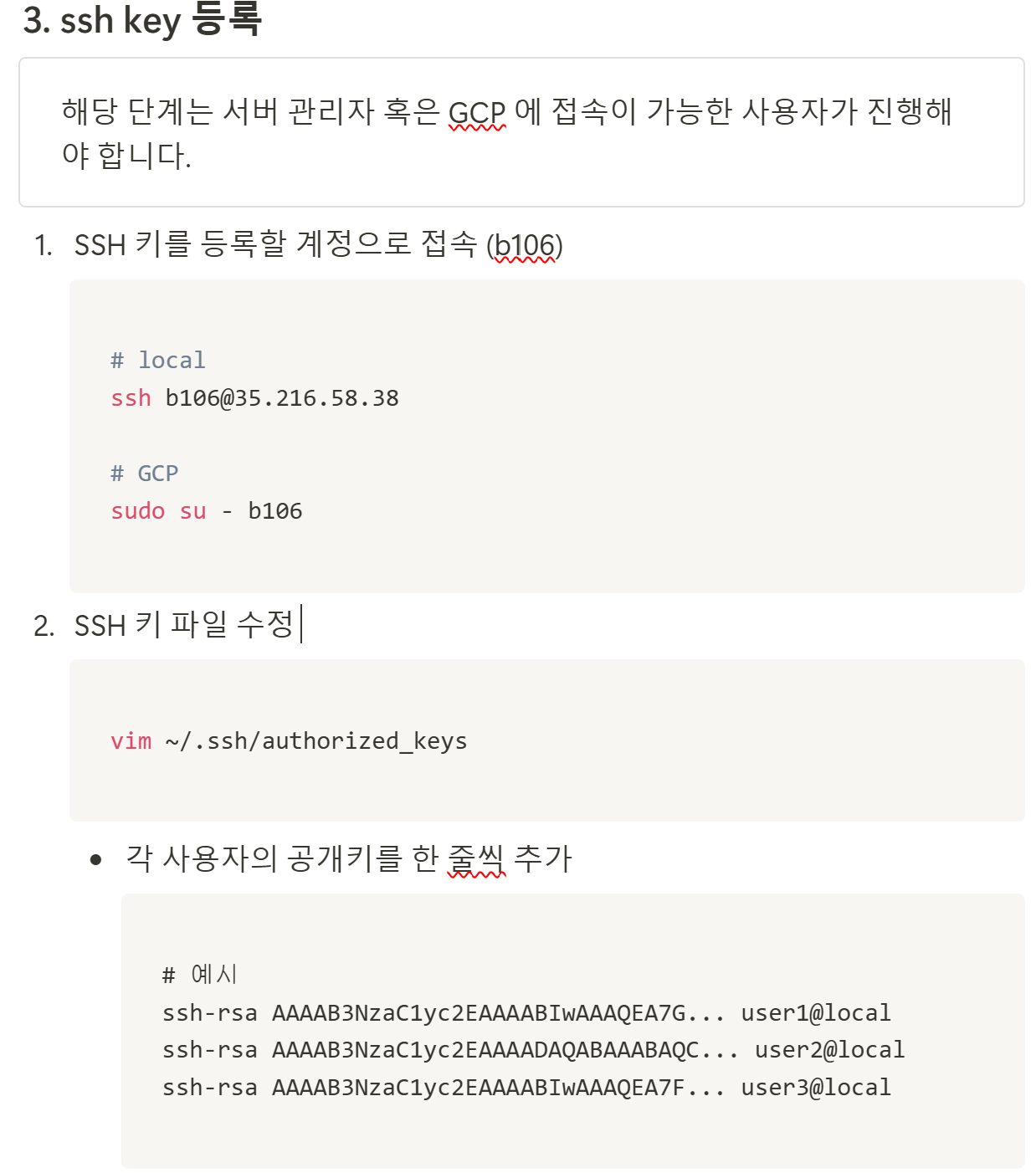 (GCP 콘솔 > Computer Engine > 설정의 메타데이터 > SSH 키 등록)