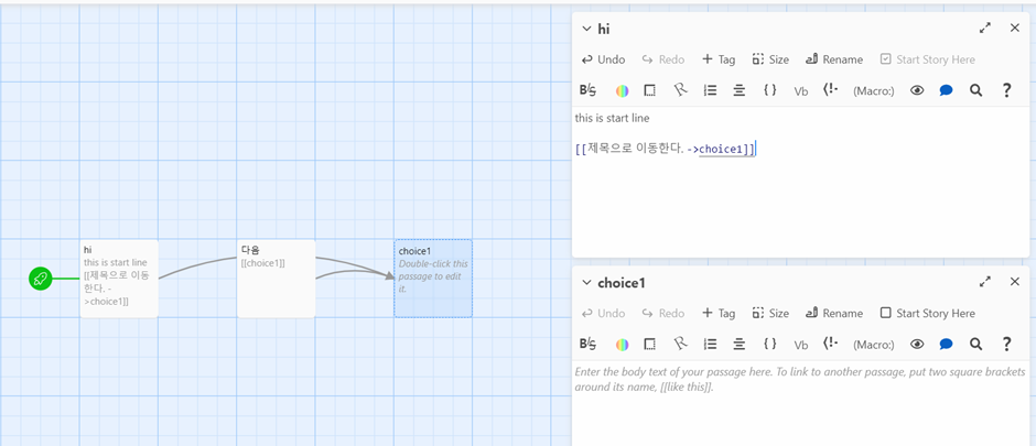Test From Here는 특정 passage부터 이야기 흐름을 볼 수 있도록 하는 것이고, Start Story Here는 아예 스토리의 시작 passage를 바꾸는 것이다.
