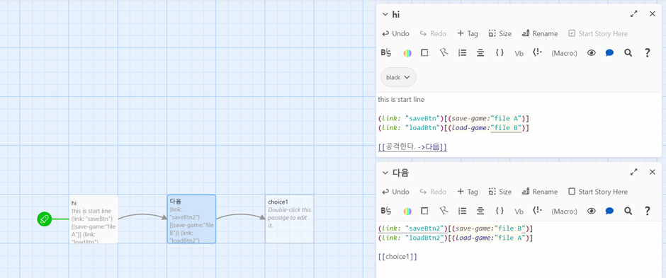 1. save 버튼을 누르고 다른 passage 에서 load 버튼을 누르면 save 버튼을 누른 passage로 이동한다.