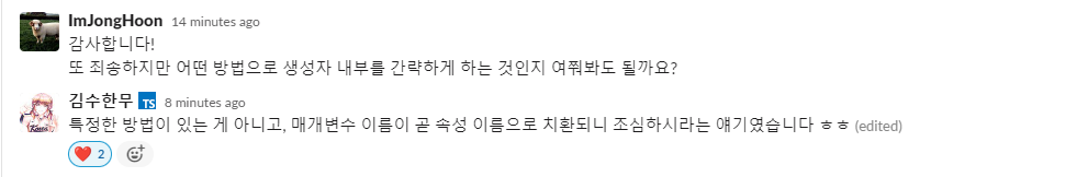 즉, 생성자의 매개변수에 접근 지정자 public 까지 써서 선언해주는건 typescript에 있는 속성(변수)선언과 할당을 동시에 하는 매크로 방식.